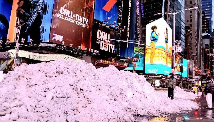 Many tourists flocked to Times Square amid the cleared snow piled into mini-mountains by emergency workers.